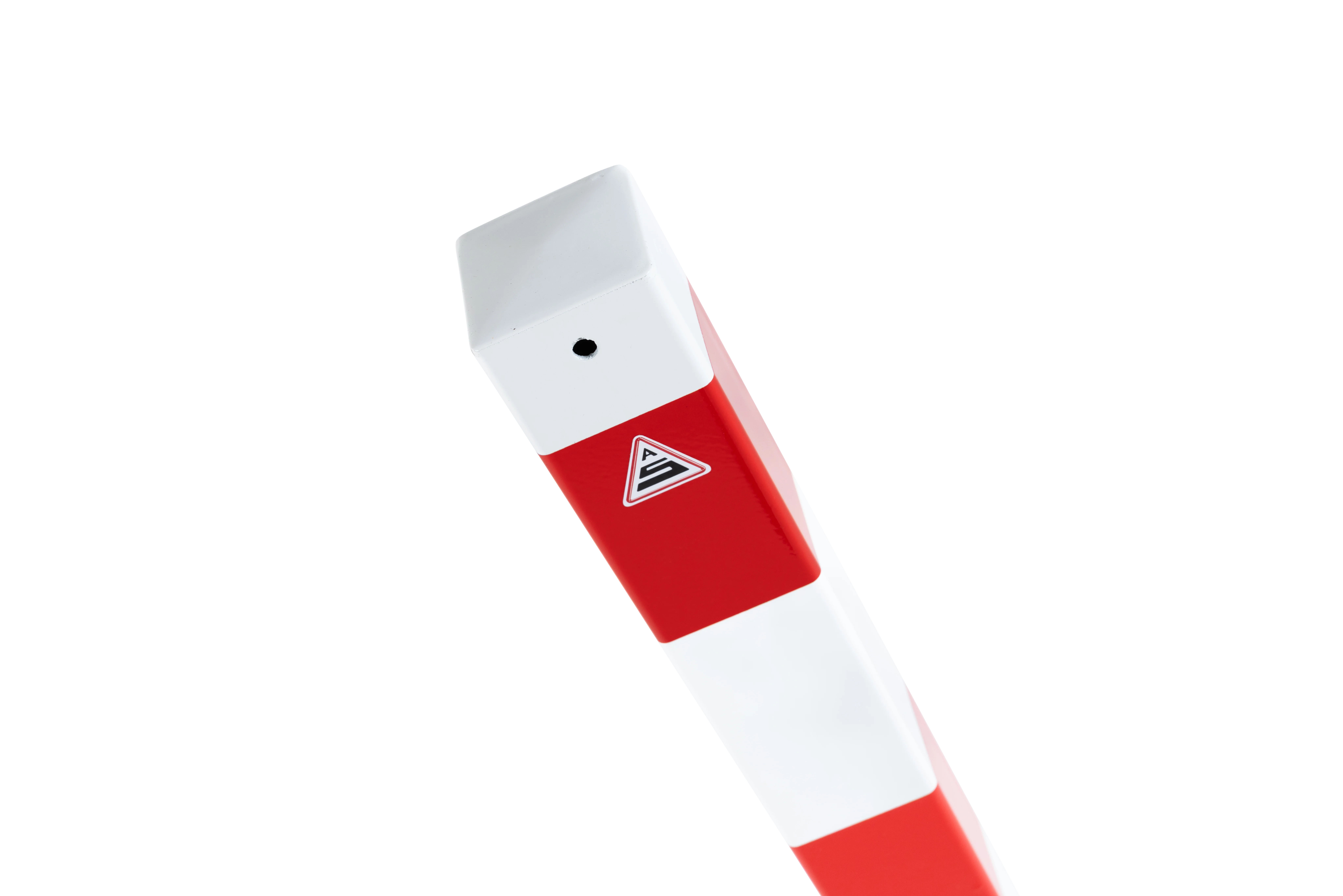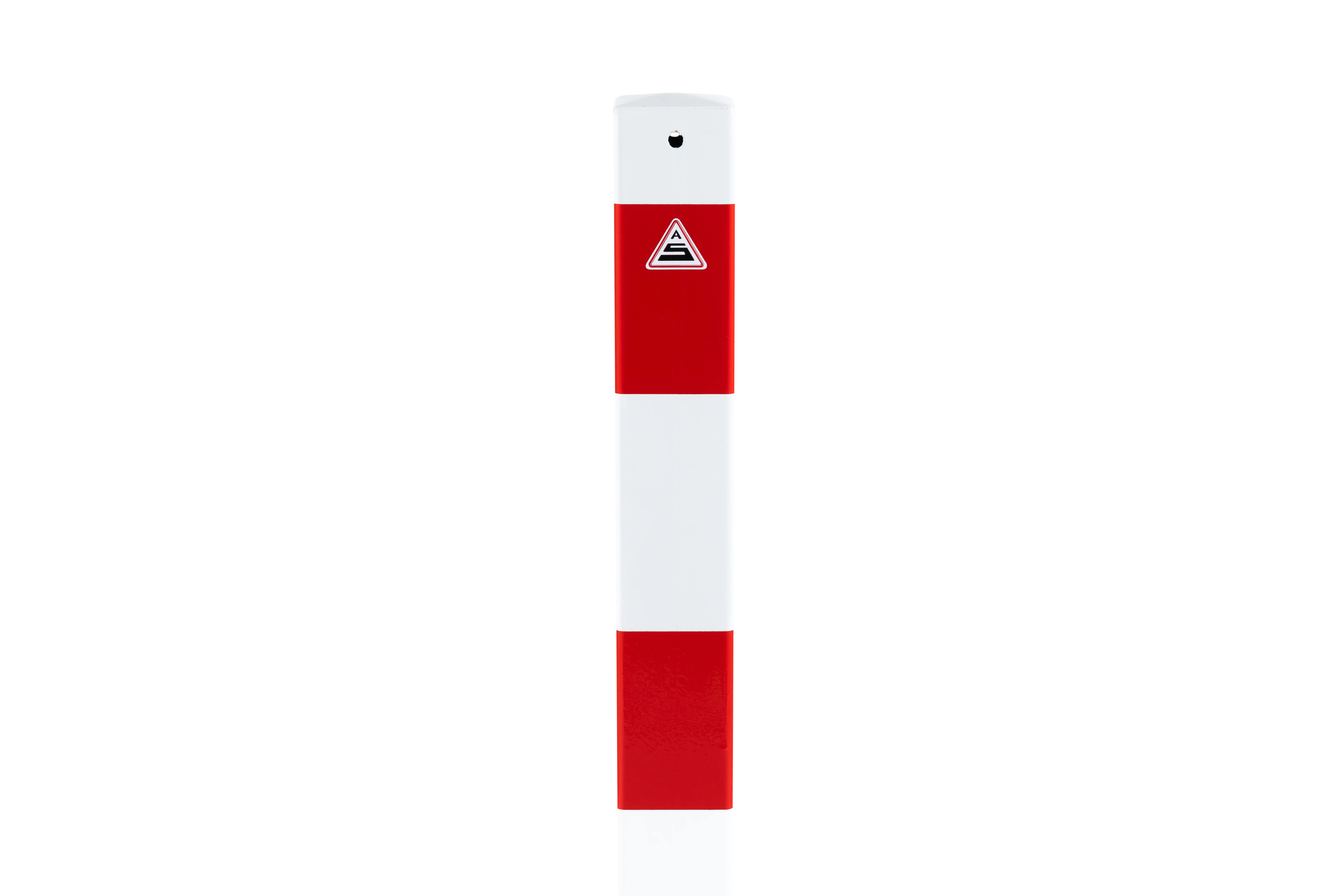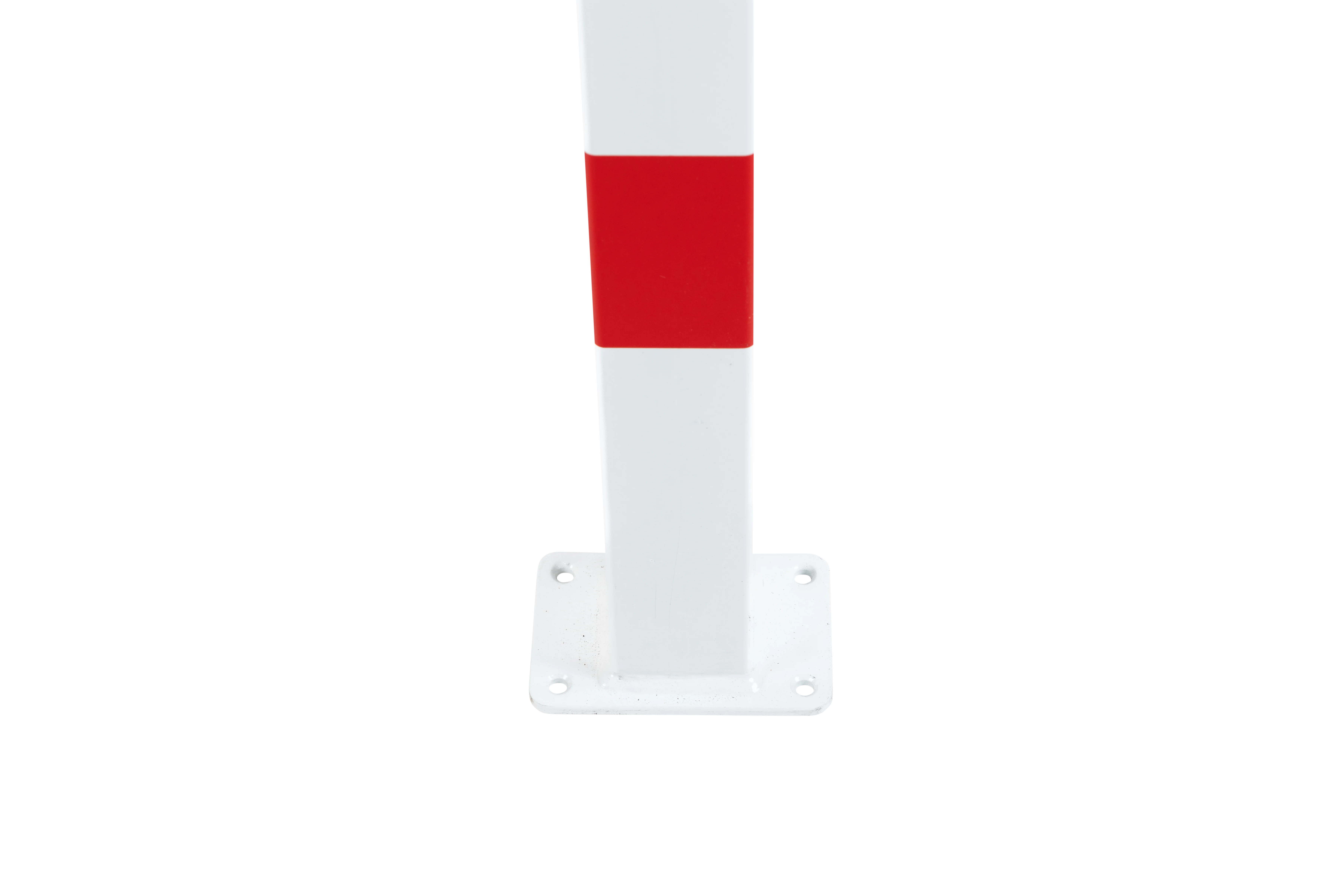 Die Befestigung des Absperrpfostens erfolgt über eine angeschweißte Bodenplatte (100 × 150 mm) mittels Dübeln – ideal für die Montage auf festen Untergründen wie Beton oder Asphalt. Die feuerverzinkte und weiß beschichtete Oberfläche schützt dauerhaft vor Korrosion, während drei rot reflektierende Leuchtstreifen für eine deutlich erhöhte Sichtbarkeit sorgen – bei Tag wie bei Nacht.