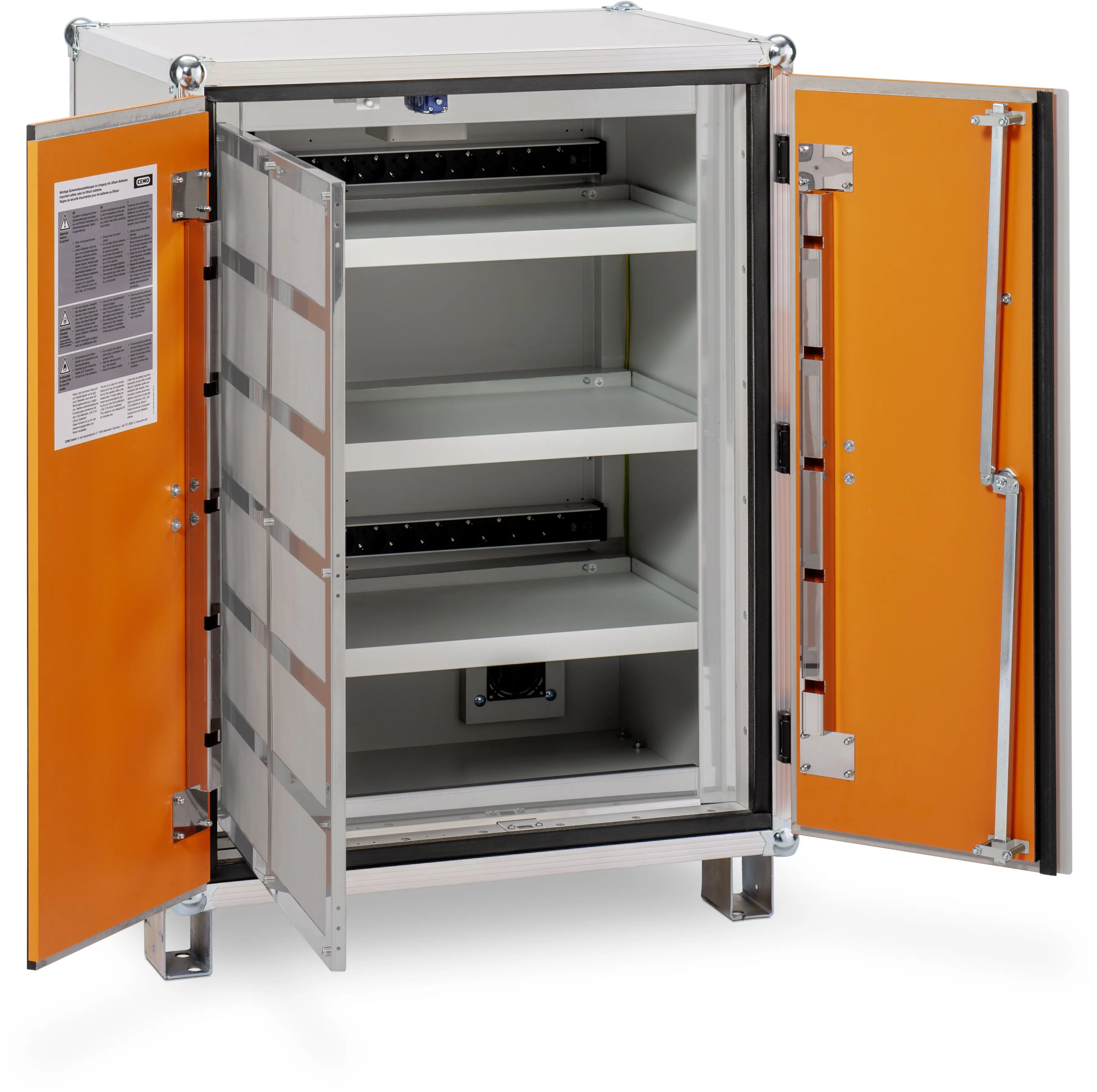 Der Akku-Ladeschrank Basic 8/10 (1-phasig) bietet eine sichere, feuerresistente Lösung für das Laden und Lagern von Lithium-Ionen-Akkus – ideal für Kommunen, Bauhöfe, Handwerksbetriebe und Industrie. Mit Brandschutztechnologien, integrierter Lüftung und automatischer Stromunterbrechung bei Überhitzung erhöht er die Sicherheit deutlich.