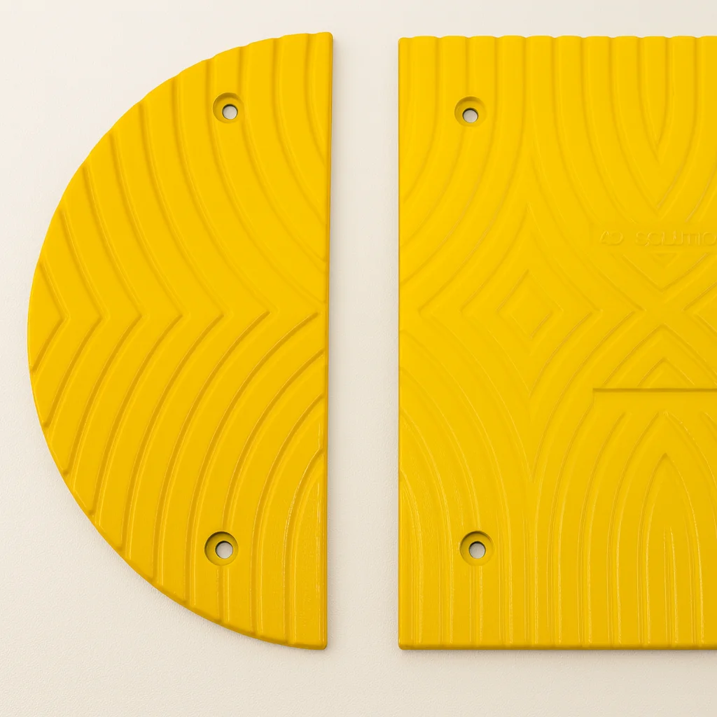 Das modulare System ermöglicht eine flexible Anpassung an jede Einbausituation – durch einfach kombinierbare Mittel- und Endstücke. Die Oberfläche ist mit gelben Reflektorelementen ausgestattet und sorgt für hervorragende Sichtbarkeit bei Tag und Nacht. Die Bodenschwelle ist wetterfest, UV-beständig und für den ganzjährigen Einsatz im Freien geeignet.
