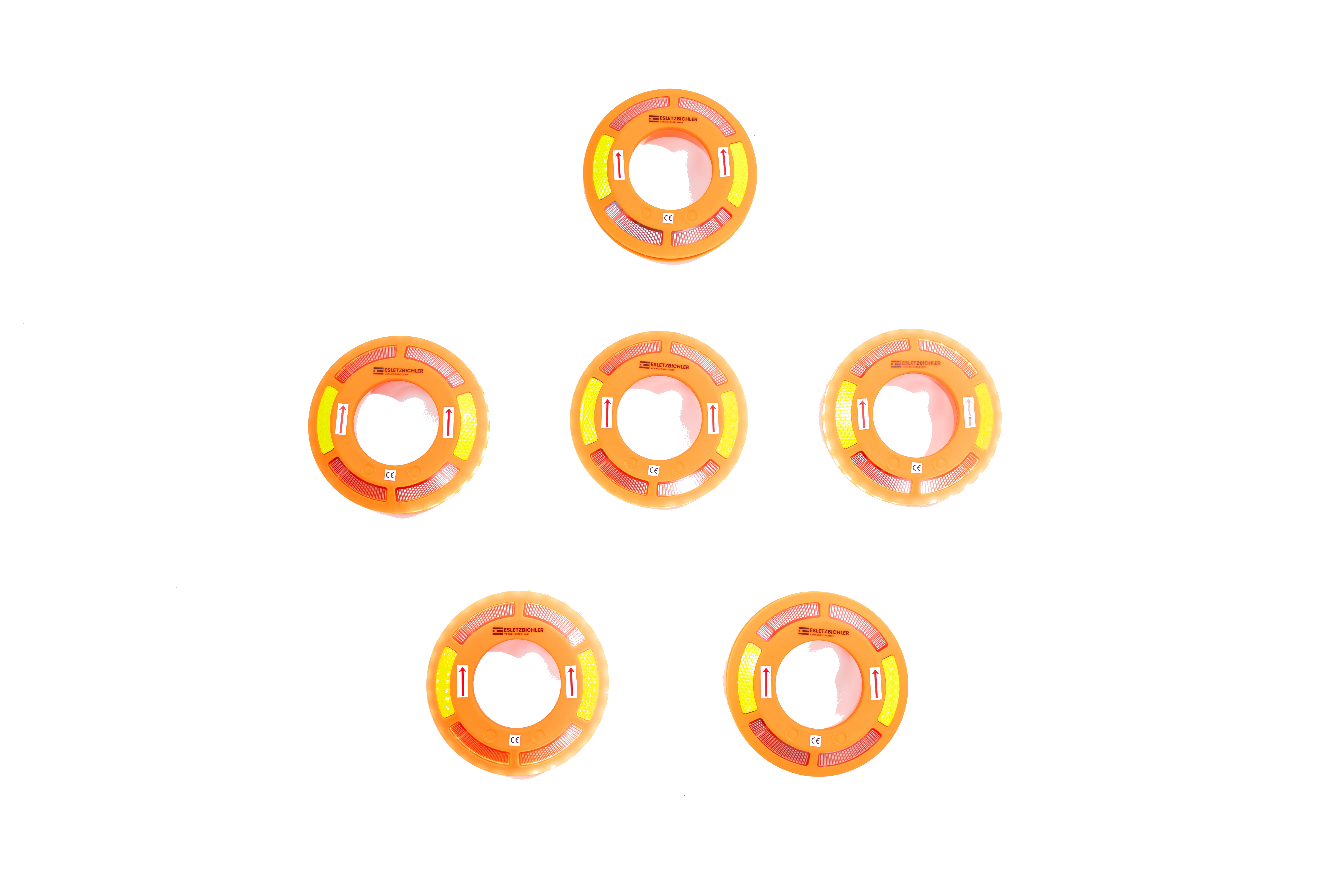 Mit 6 hochwertigen LED-Leuchtringen, die auf allen Typen von Leitkegeln montiert werden können, sorgt das Set für maximale Flexibilität und Sichtbarkeit – auch bei schlechten Lichtverhältnissen. Die sechs verschiedenen Betriebsmodi ermöglichen eine Anpassung je nach Einsatzsituation: von konstantem Licht bis zu auffälligem Lauflicht.