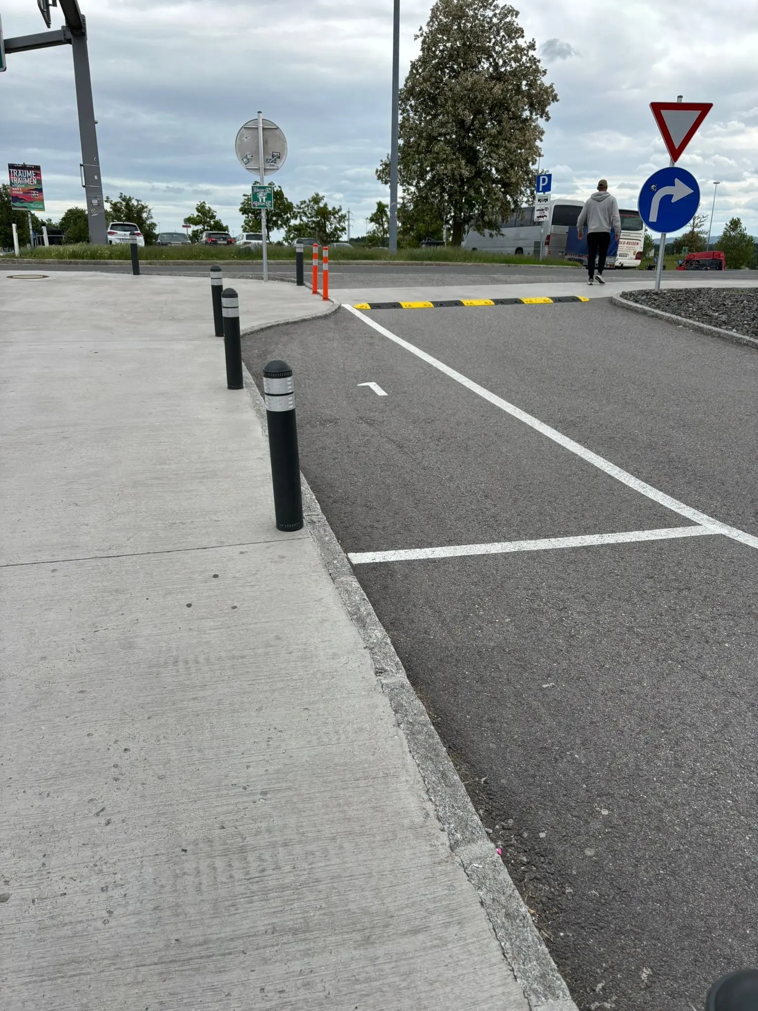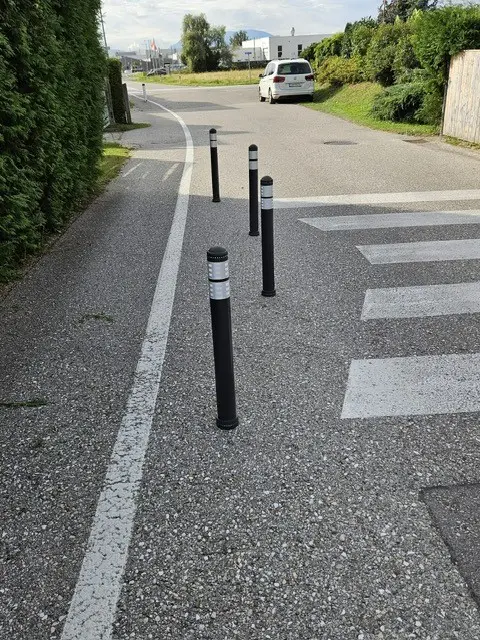 Der Poller ist ausschließlich in geeigneten Bodenhülsen oder Fundamenten zu montieren. Die Montage sollte senkrecht und standsicher erfolgen. Die reflektierenden Elemente müssen frei von Verschmutzung gehalten werden, um eine optimale Sichtbarkeit zu gewährleisten.Der Poller dient der visuellen Verkehrsführung und leichten Zugangskontrolle. Er ist nicht als Anfahrschutz für schwere Fahrzeuge vorgesehen.
