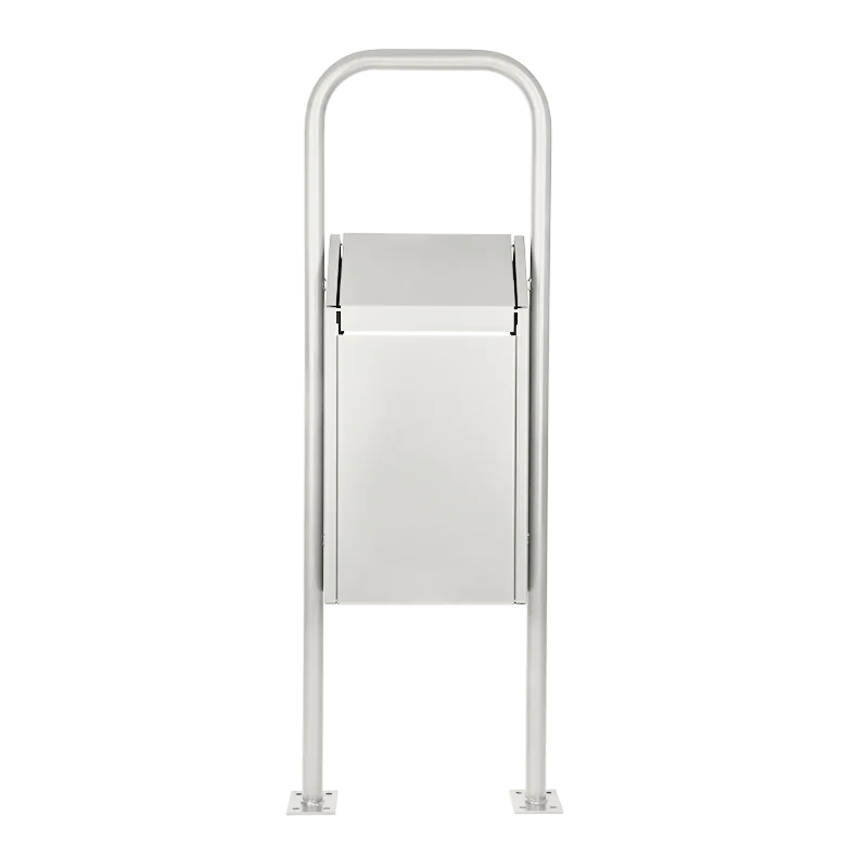 Der Behälter wird vollständig vormontiert geliefert und lässt sich mithilfe des im Lieferumfang enthaltenen Bodenankers sicher im Boden verankern. Die Montage erfolgt über die mitgelieferten Schrauben direkt am Bodenanker – für maximale Stabilität und Schutz vor Vandalismus. Der Bügel sorgt nicht nur für zusätzliche Standfestigkeit, sondern unterstreicht auch die klare Linienführung des Designs.